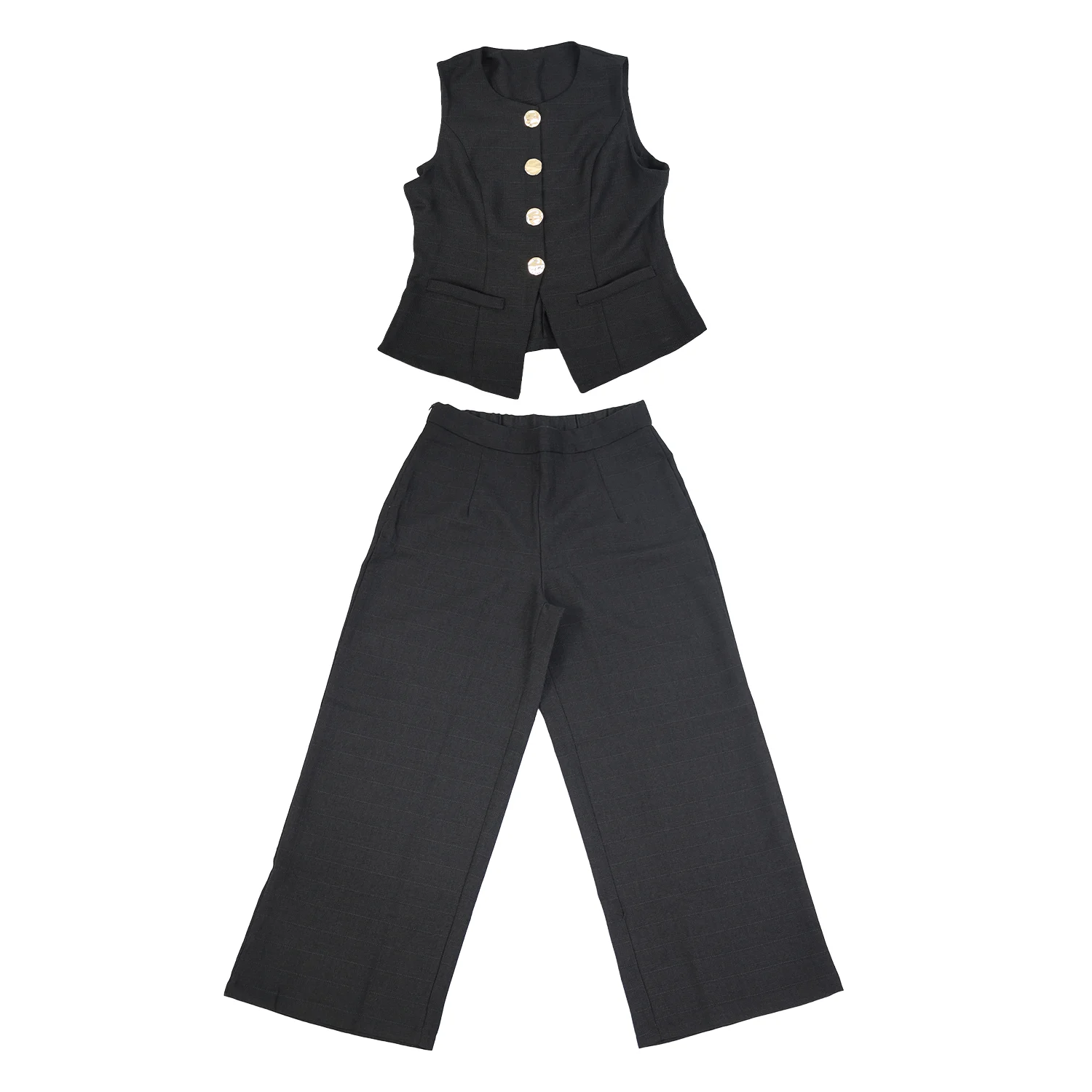 • Chaleco Sastrero con Detalles Dorados: Presenta un diseño sin mangas con un clásico cuello redondo y cierre frontal de cuatro botones dorados de gran tamaño que actúan como piezas de joyería. Su corte entallado con pinzas frontales define la cintura, mientras que el bajo en punta añade un toque arquitectónico muy chic.