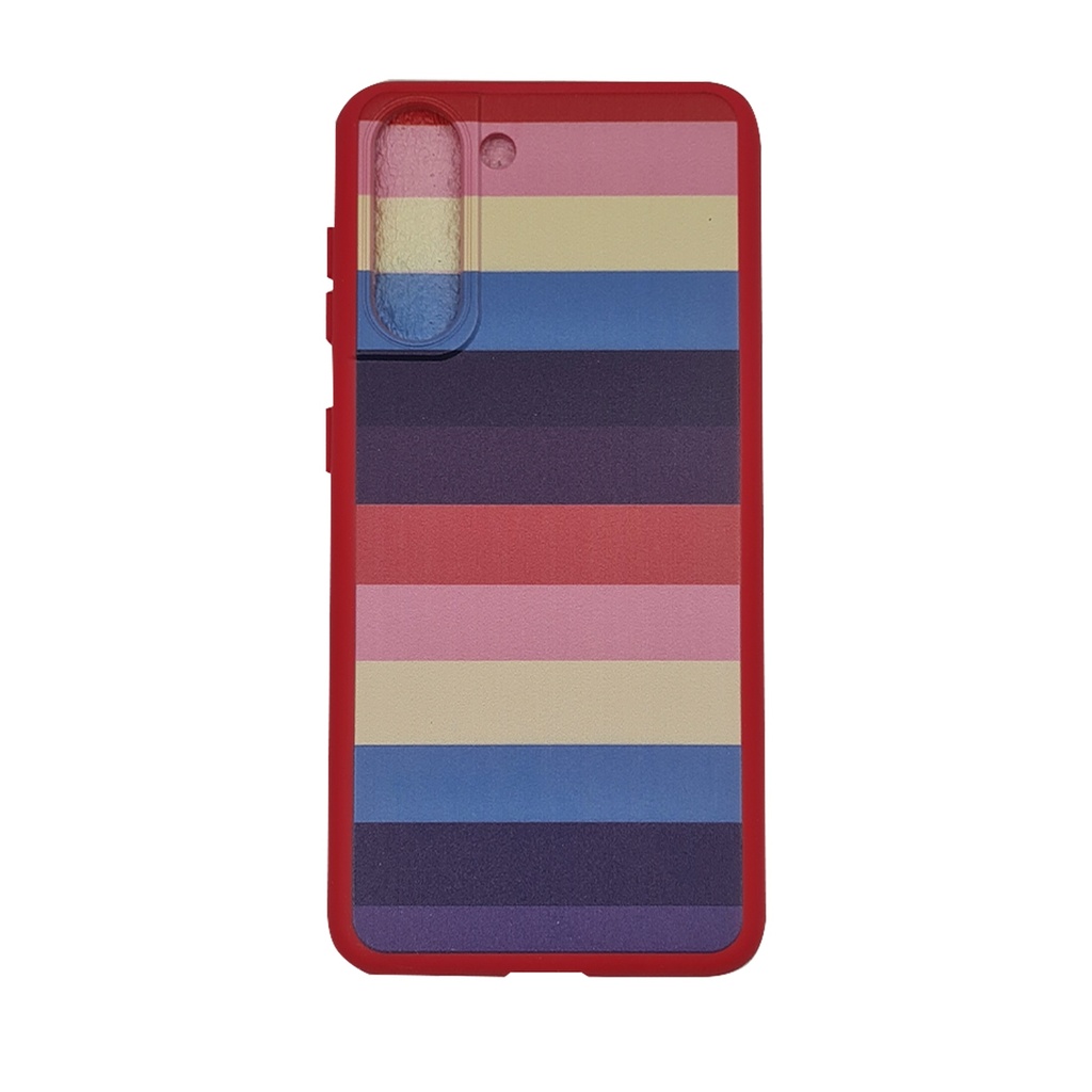 Funda para el Samsung Galaxy S21 destaca por su llamativo diseño de rayas horizontales multicolores con un borde protector de color rojo sólido. El patrón alterna franjas en tonos crema, rosa, azul, morado y borgoña, dándole una apariencia moderna y vibrante.