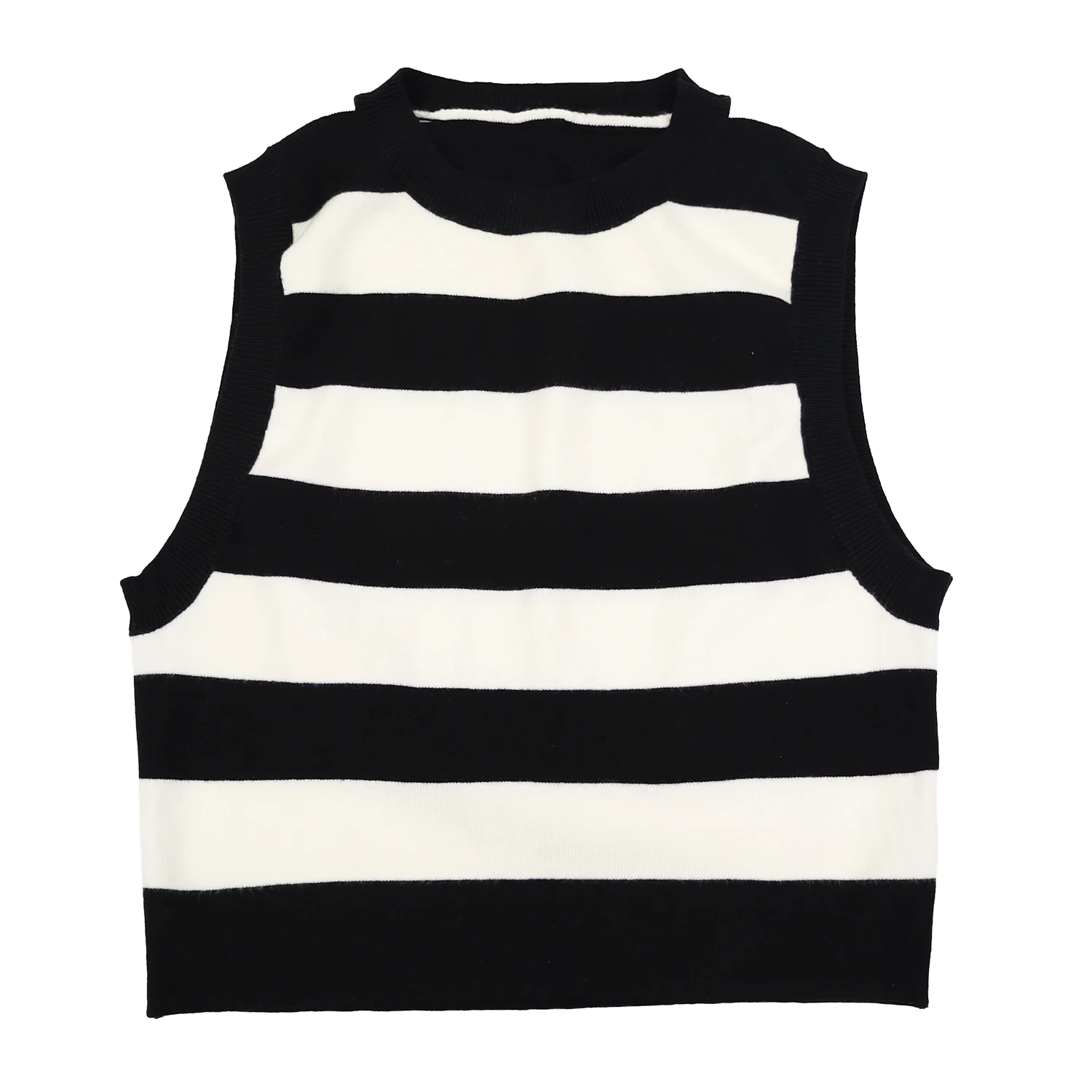 • Diseño: Top de punto sin mangas con un clásico patrón de rayas horizontales contrastadas. Cuenta con un cuello redondo (crew neck) con acabado acanalado que enmarca el rostro con elegancia.
