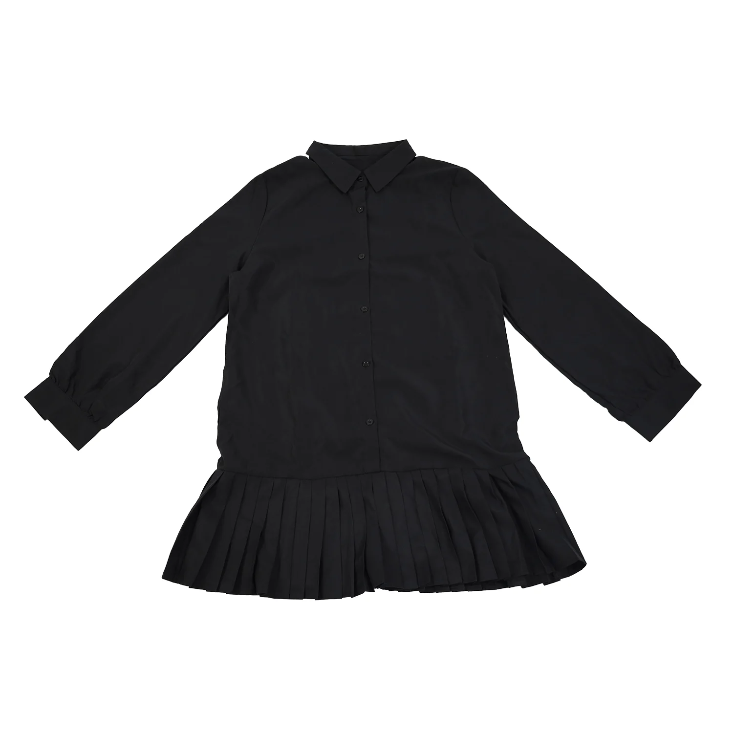 • Diseño y Estilo: Se trata de un minivestido tipo camisa con cuello clásico de solapa y mangas largas que incluyen puños abotonados. Su característica más distintiva es el bajo plisado que aporta movimiento y fluidez a la prenda.